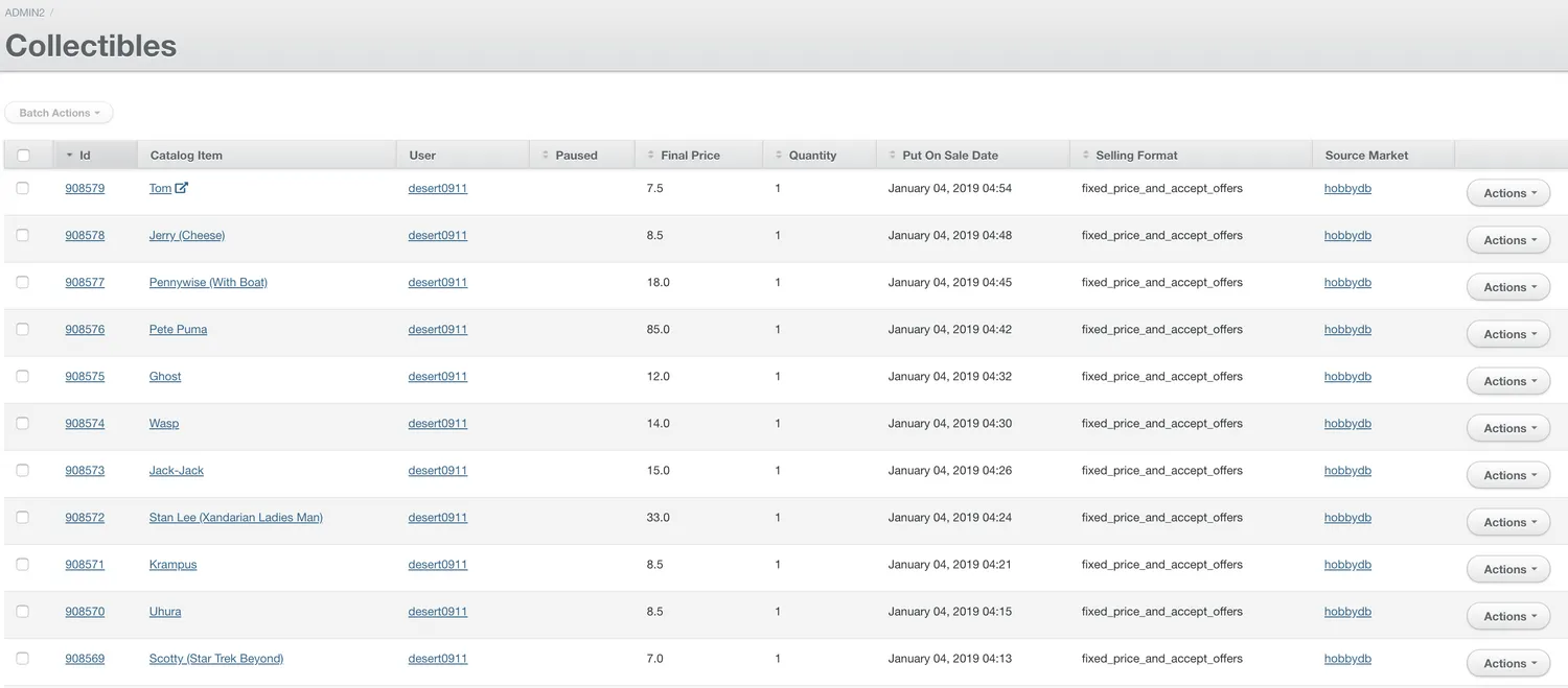 The administrator dashboard is of particular importance within hobbyDB. As a platform for buyers and sellers, it can be pretty self-contained. However, in addition to the marketplace, hobbyDB maintains hundreds of thousands of catalog items and subjects within the platform. Imagine, every variant of a particular hot wheel. This data is meticulously maintained, and administrators are constantly managing these items. Additionally, through the use of algorithms they’re able to assign value to catalog items so users can see how much their collections should be worth.